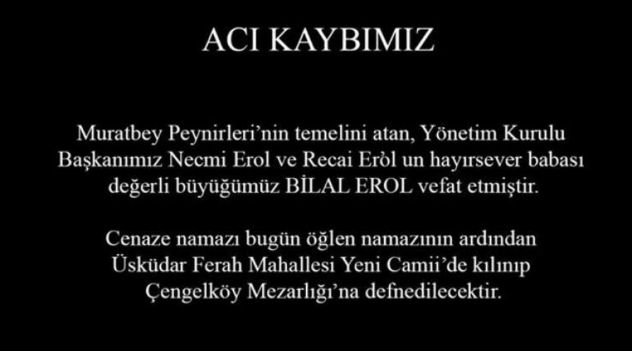 İstanbul Eminönü'nde Muratbey Peynirleri'nin temellerini atan, Muratbey Peynirleri Yönetim Kurulu Başkanı Necmi Erol ve Yönetim Kurulu Başkan Yardımcısı Recai Erol'un babası Bilal Erol, vefat etti.