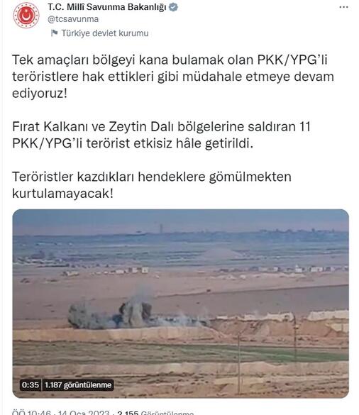 Bakanlığın Twitter'daki hesabından yapılan açıklamada, "Tek amaçları bölgeyi kana bulamak olan PKK/YPG’li teröristlere hak ettikleri gibi müdahale etmeye devam ediyoruz. Fırat Kalkanı ve Zeytin Dalı bölgelerine saldıran 11 PKK/YPG’li terörist etkisiz hale getirildi. Teröristler kazdıkları hendeklere gömülmekten kurtulamayacak" denildi.