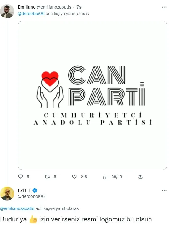 "Şu an gencim ama ileride siyasete atılmayı düşünüyorum. Gelin partimizi hep beraber kuralım. İsmi Can Parti olsun. Cumhuriyetçi Anadolu Partisi. Logosu kalp olsun. Canınıza can katmaya geldik falan gibi sloganlar. Hatta eli Photoshop tutan arkadaşlar bu hayali partiye can katabilir.