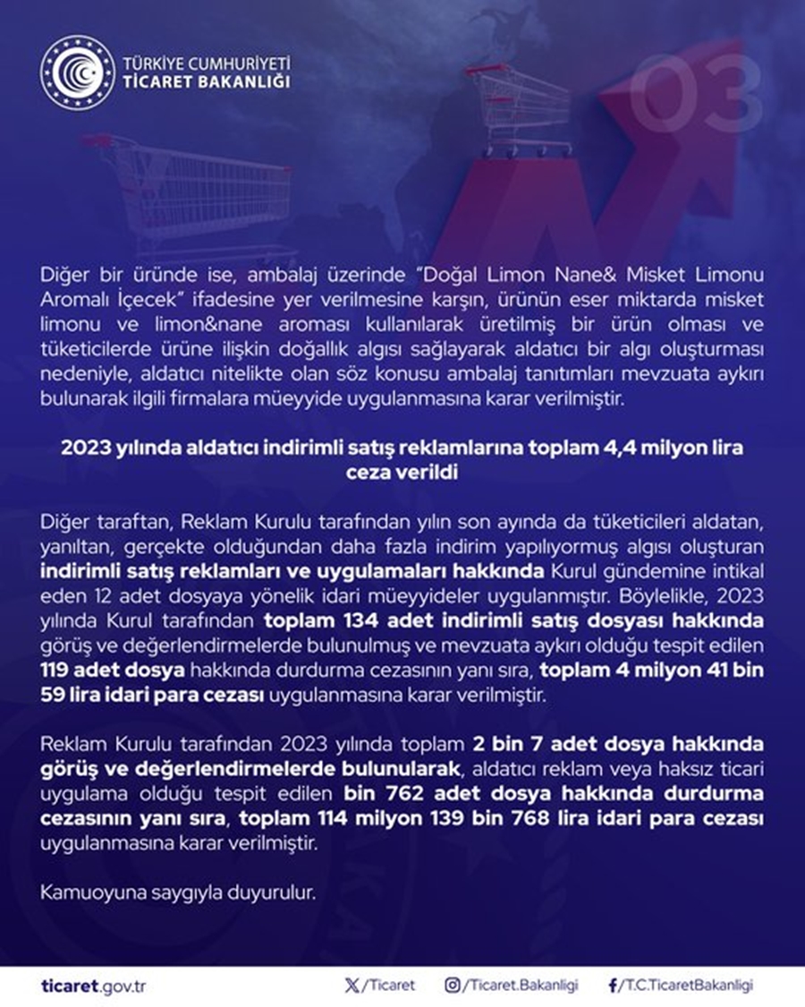 Reklam Kurulu, 2023 yılında toplam 134 adet indirimli satış dosyasını inceledi. Bu incelemeler sonucunda 119 dosyanın mevzuata aykırı olduğu tespit edildi ve ilgili reklamların durdurulması cezası verildi. Bu dosyalara toplam 4 milyon 41 bin 59 TL idari para cezası uygulanmasına karar verildi.