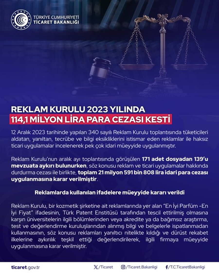 Reklam Kurulu, 2023 yılında tüm konularda toplam 2.007 adet dosyayı inceledi. Bu dosyaların 1.762'si hakkında dosya durdurma cezası verilirken, toplamda 114 milyon 139 bin 768 TL idari para cezası kesildi.