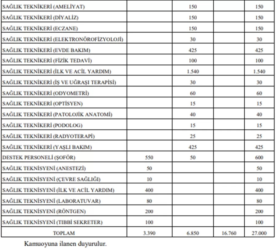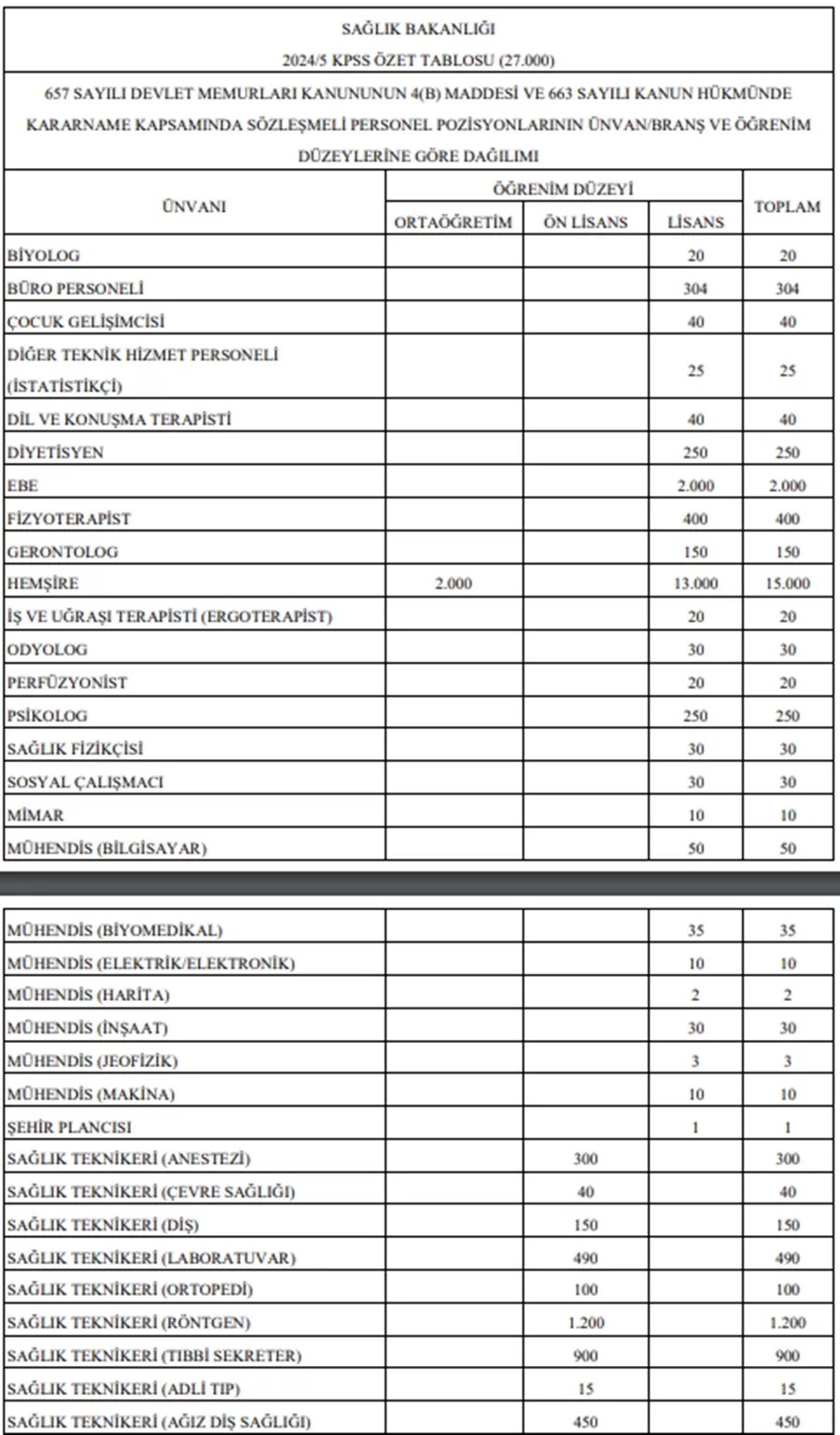 27 bin sözleşmeli personel alımında unvan/branş ve öğrenim düzeylerine göre dağılım şu şekilde belirlendi:- Hemşire: 15 Bin