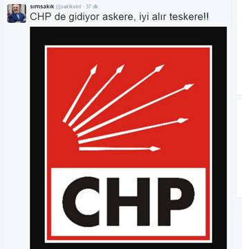 CHP'nin yarın Suriye tezkeresi için yapılacak görüşmelerde "evet" oyu kullanacağının ortaya çıkması üzerine Ağrı Belediye Başkanı Sırrı Sakık'tan tepki geldi... Sakık Twitter hesabından "CHP de gidiyor askere, iyi alır tezkere!" diye yazdı.