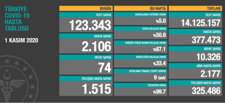 Sağlık Bakanı Koca, 1 Kasım tarihli koronavirüs tablosunu paylaştı. Son 24 saatte yapılan test sayısı 123 bin 343 olurken, hasta sayısı 2 bin 106 olarak açıklandı. Bugün 74 kişi koronavirüsten hayatını kaybetti. Son 24 saatte bin 515 hasta ise iyileşti. Bakan Koca Twitter'dan yaptığı açıklamada şunları ifade etti;