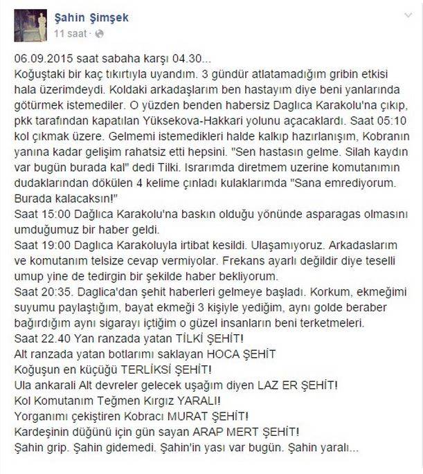 Hakkari Dağlıca'da PKK'nın mayınlı saldırısı sonucu 16 asker şehit düştü. Saldırıda 6 asker de hafif yaralandı. Dağlıca'daki kanlı saldırıdan şans eseri kurtulan isimlerden birisi de Şahin Şimşek isimli asker. 20 yaşındaki Şimşek, Dağlıca saldırısının yapıldığı gün neler yaşadığını sosyal paylaşım sitesi Facebook'taki hesabından paylaştı. Hasta olduğu için arkadaşlarının kendisini operasyona götürmek istemediğini son olarak da komutanının 'Sana emrediyorum, burada kalacaksın' dediği için asker arkadaşlarıyla operasyona gidemediğini ifade eden Şahin Şimşek, şunları yazdı: