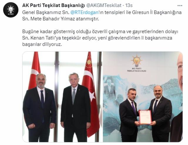 Buna göre Erzurum İl Başkanlığına İbrahim Küçükoğlu, Gümüşhane İl Başkanlığına Mehmet Emin Erdoğdu, Giresun İl Başkanlığına Mete Bahadır Yılmaz, Kocaeli İl Başkanlığına Şahin Talus ve Mersin İl Başkanlığına Adem Aldemir atandı.