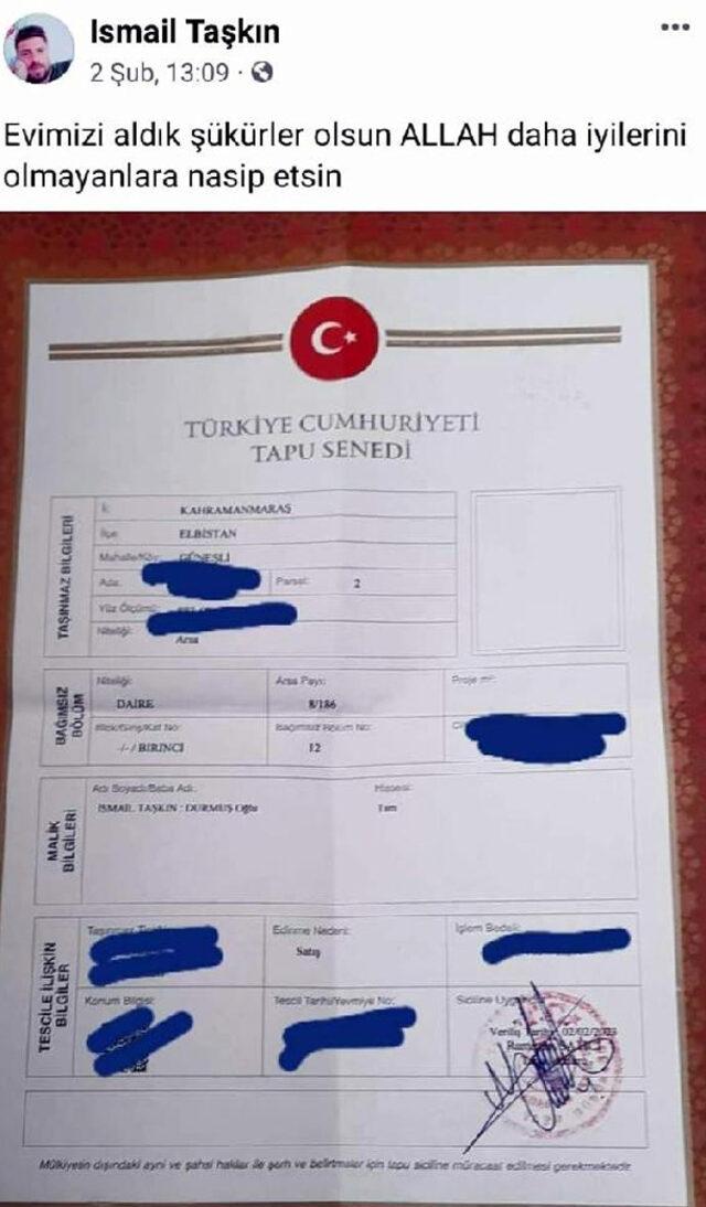 İsmail Taşkın, birikimi ile 2 Şubat günü Güneşli Mahallesi'nde satın aldığı dairenin tapusunun sevincini sosyal medya hesabından paylaştı.