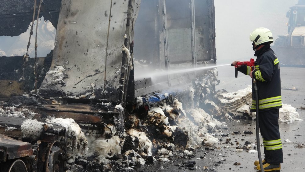 Araç sürücüsü yangını fark edince TIR'ı kenara çekip kendisi son anda dışarı attı.