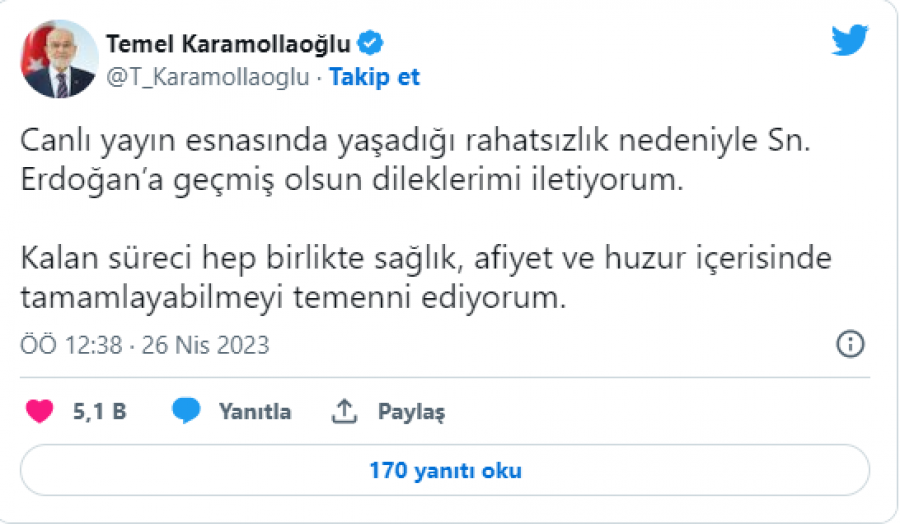 Saadet Partisi Genel Başkanı Temel Karamollaoğlu Twitter'dan yaptığı paylaşımda "Canlı yayın esnasında yaşadığı rahatsızlık nedeniyle Sn. Erdoğan'a geçmiş olsun dileklerimi iletiyorum. Kalan süreci hep birlikte sağlık, afiyet ve huzur içerisinde tamamlayabilmeyi temenni ediyorum" ifadelerini kullandı.