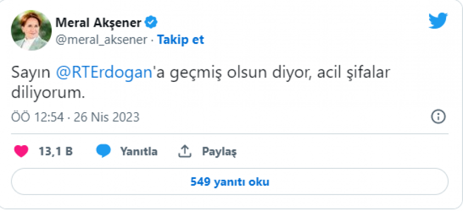 İYİ Parti Genel Başkanı Meral Akşener "Sayın @RTErdogan'a geçmiş olsun diyor, acil şifalar diliyorum" paylaşımı yaptı.