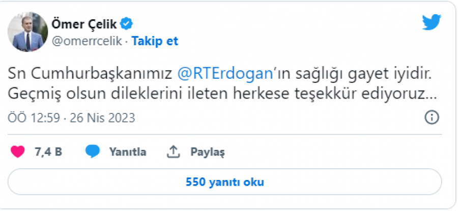 AK Parti Genel Başkan Yardımcısı ve Parti Sözcüsü Ömer Çelik'ten de Erdoğan'ın sağlığıyla ilgili açıklama geldi. Çelik Twitter'dan yaptığı paylaşımda "Sn Cumhurbaşkanımız @RTErdogan'ın sağlığı gayet iyidir. Geçmiş olsun dileklerini ileten herkese teşekkür ediyoruz..." dedi.