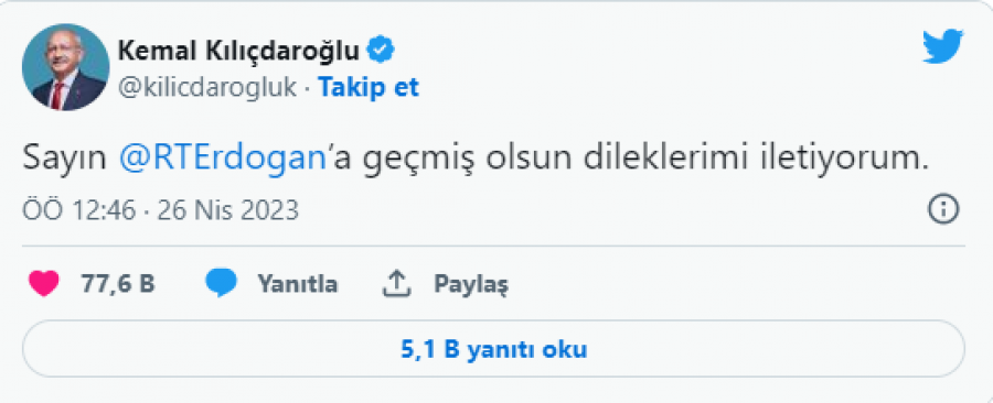 Millet İttifakı Cumhurbaşkanı Adayı ve CHP Genel Başkanı Kemal Kılıçdaroğlu, sosyal medya hesabından "Sayın @RTErdogan'a geçmiş olsun dileklerimi iletiyorum" paylaşımı yaptı.