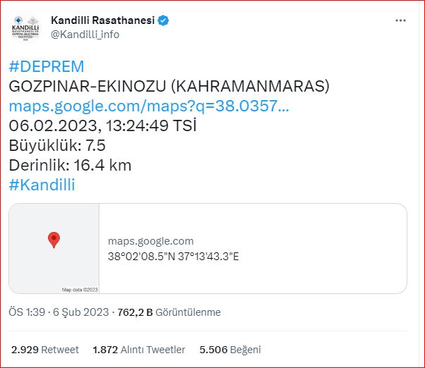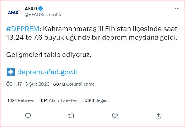 Afet ve Acil Durum Yönetimi Başkanlığından (AFAD) alınan bilgiye göre, Kahramanmaraş'ta bu kez 7.6 büyüklüğünde yeni bir deprem meydana geldi. Saat: 13.24'te yerin 7 kilometre derinliğinde meydana gelen depremin merkez üssünün Elbistan ilçesi olduğu ve birçok ilden hissedildiği bildirildi. Çevre illerde bir önceki depremde hasar alan bazı binaların yıkıldığı öğrenildi.