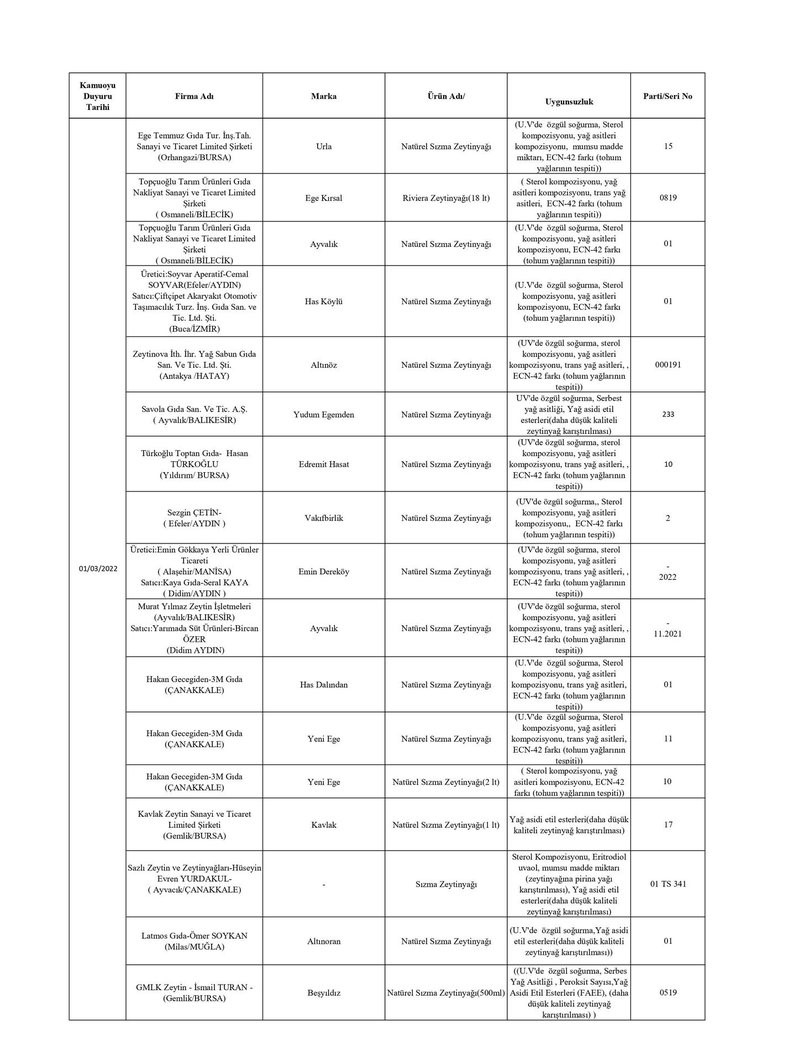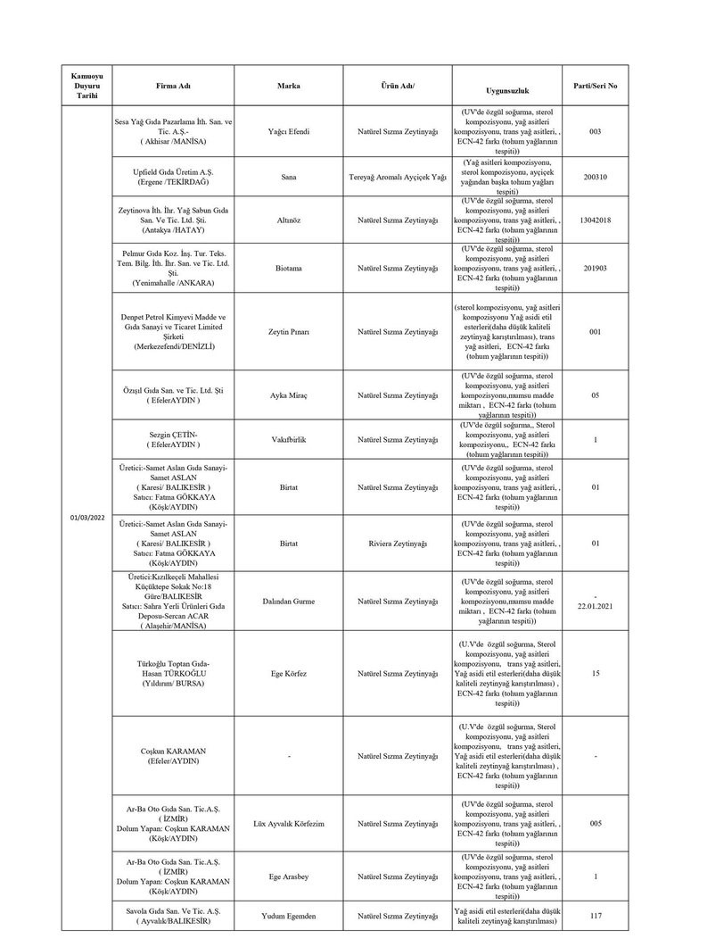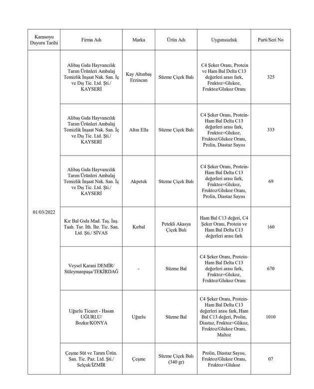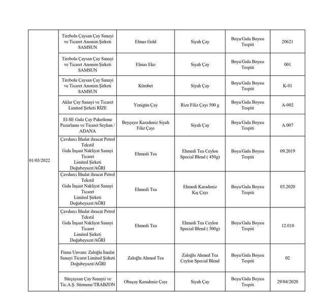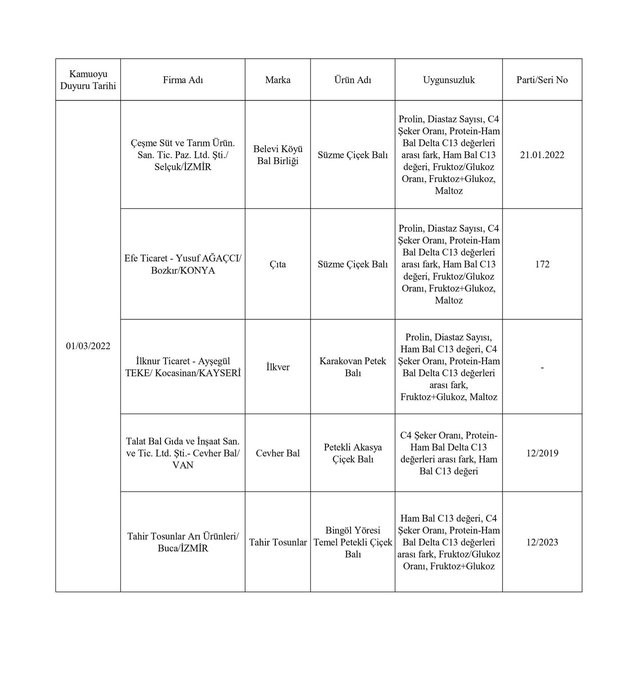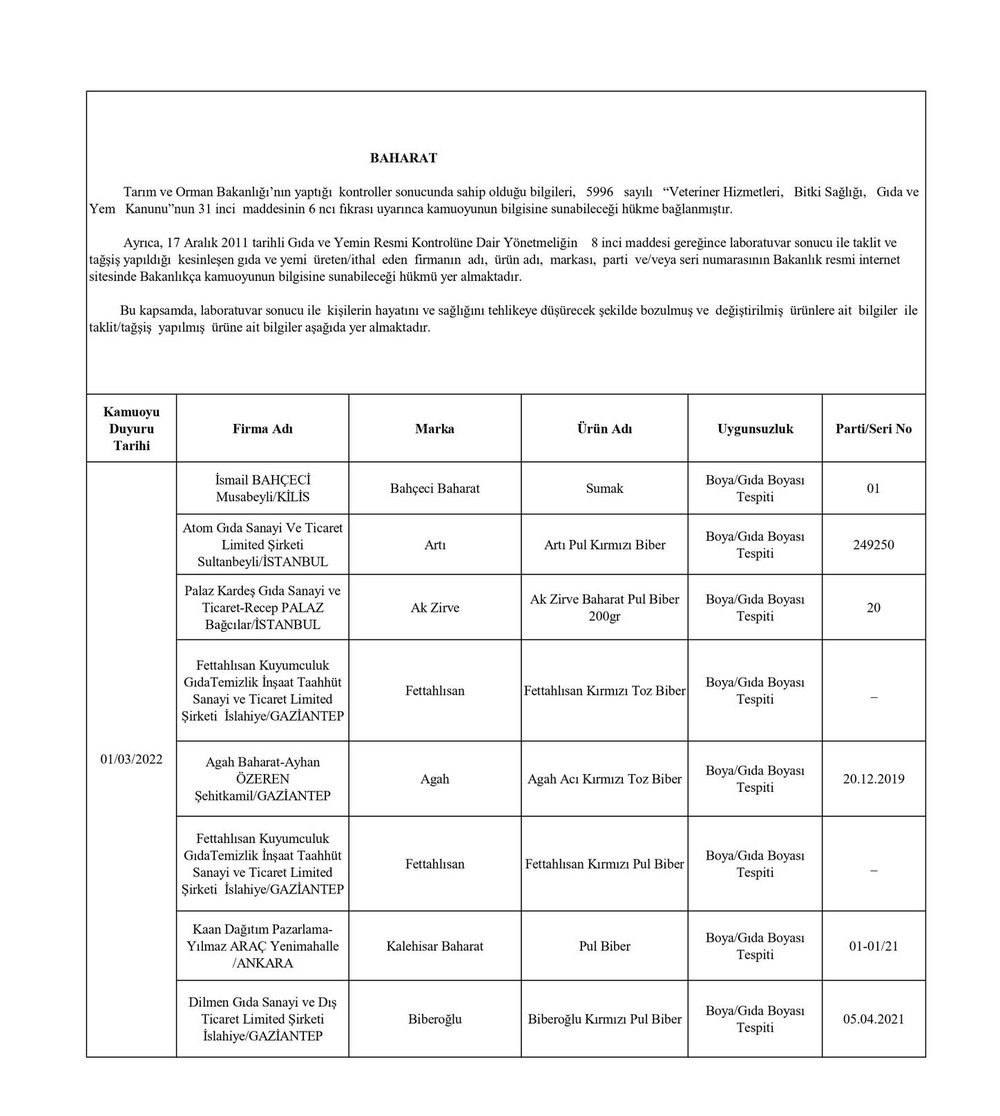 Tarım ve Orman Bakanlığından yapılan yazılı açıklamada, “Ülkemizde gıda güvenilirliğinin sağlanması, gıdalarda taklit ve tağşişin önlenmesi, kişilerin sağlığının ve tüketici menfaatlerinin korunması ile sektörde haksız rekabetin engellenmesi amacıyla gıda ve gıda ile temas eden madde ve malzemelerin üretim, işleme ve dağıtımının tüm aşamalarında resmi kontrol faaliyetleri Tarım ve Orman Bakanlığı tarafından titizlikle yürütülmektedir. 5996 sayılı Veteriner Hizmetleri, Bitki Sağlığı, Gıda ve Yem Kanunu ve bu Kanun kapsamında hazırlanan Gıda ve Yemin Resmi Kontrollerine Dair Yönetmelik gereğince; laboratuvar sonucuyla taklit veya tağşiş yapıldığı kesinleşen gıdaları üreten/ithal eden; kişilerin hayatını ve sağlığını tehlikeye düşürecek şekilde bozulmuş, değiştirilmiş gıdaları üreten ve/veya satan firmanın adı, ürün adı, markası, parti ve/veya seri numarasını içeren bilgiler kamuoyunun bilgisine sunulmaktadır” denildi.