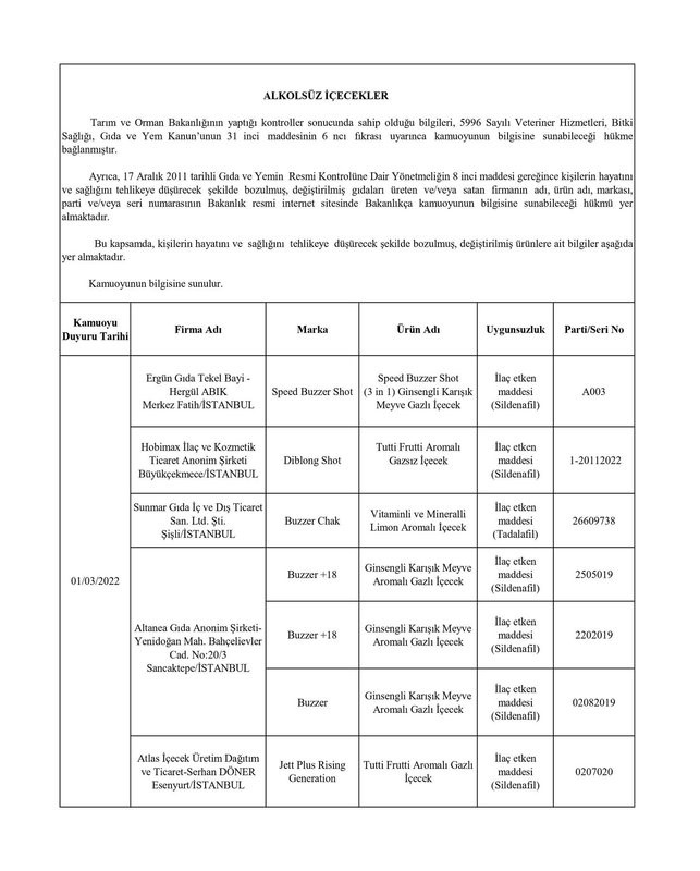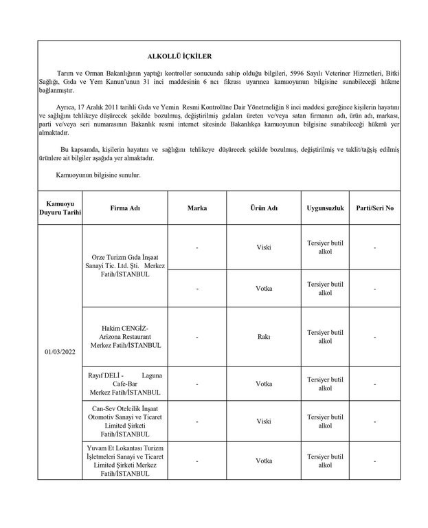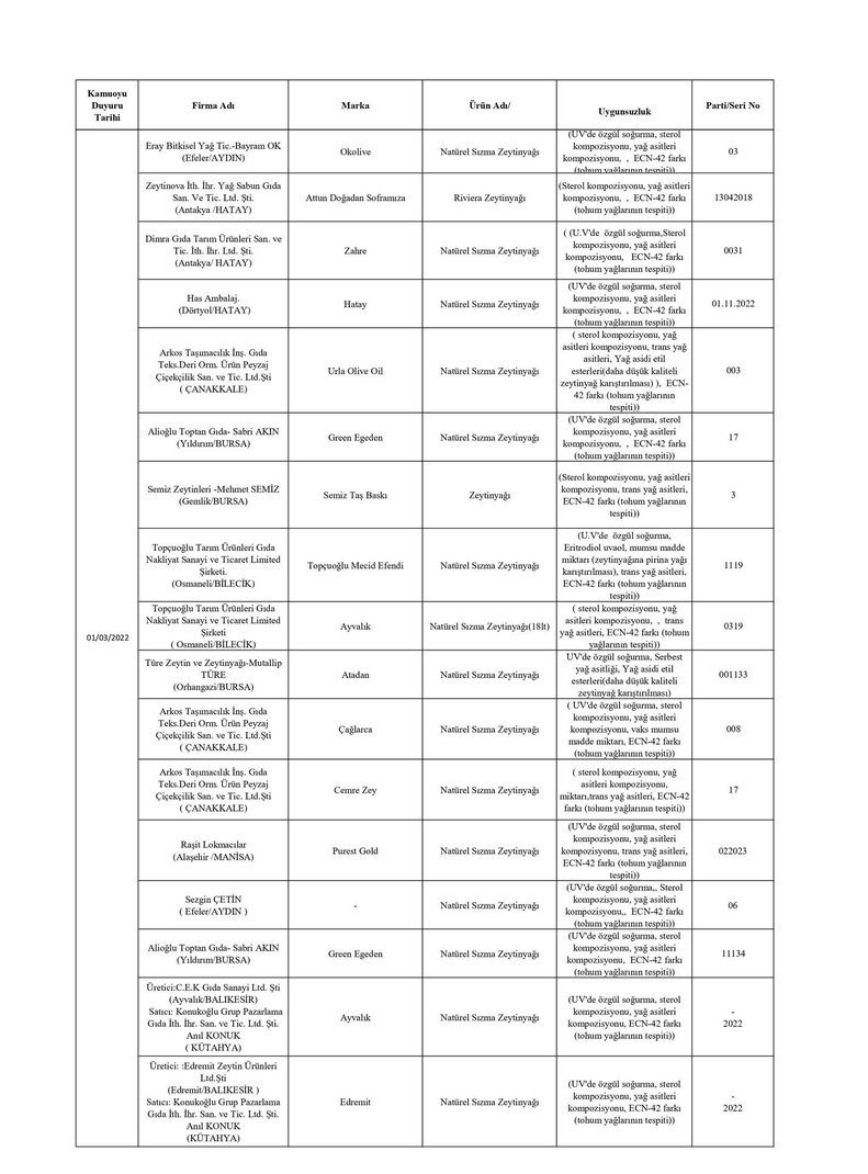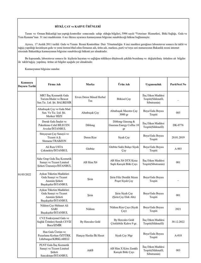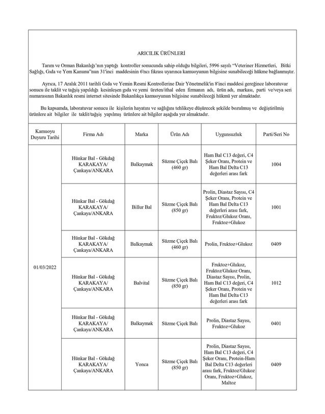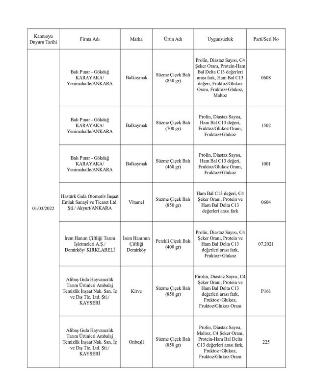 Tarım ve Orman Bakanlığından yapılan yazılı açıklamada, “Ülkemizde gıda güvenilirliğinin sağlanması, gıdalarda taklit ve tağşişin önlenmesi, kişilerin sağlığının ve tüketici menfaatlerinin korunması ile sektörde haksız rekabetin engellenmesi amacıyla gıda ve gıda ile temas eden madde ve malzemelerin üretim, işleme ve dağıtımının tüm aşamalarında resmi kontrol faaliyetleri Tarım ve Orman Bakanlığı tarafından titizlikle yürütülmektedir. 5996 sayılı Veteriner Hizmetleri, Bitki Sağlığı, Gıda ve Yem Kanunu ve bu Kanun kapsamında hazırlanan Gıda ve Yemin Resmi Kontrollerine Dair Yönetmelik gereğince; laboratuvar sonucuyla taklit veya tağşiş yapıldığı kesinleşen gıdaları üreten/ithal eden; kişilerin hayatını ve sağlığını tehlikeye düşürecek şekilde bozulmuş, değiştirilmiş gıdaları üreten ve/veya satan firmanın adı, ürün adı, markası, parti ve/veya seri numarasını içeren bilgiler kamuoyunun bilgisine sunulmaktadır” denildi.