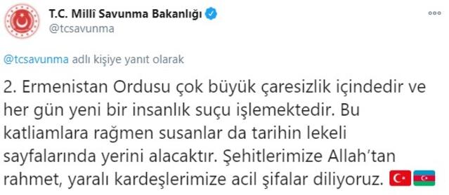 2. Ermenistan Ordusu çok büyük çaresizlik içindedir ve her gün yeni bir insanlık suçu işlemektedir. Bu katliamlara rağmen susanlar da tarihin lekeli sayfalarında yerini alacaktır. Şehitlerimize Allah’tan rahmet, yaralı kardeşlerimize acil şifalar diliyoruz.