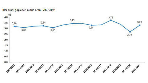Buna göre, Türkiye'de 2007-2008 döneminde yüzde 3,18 olan iller arası göç eden nüfus oranı, yıllar içinde inişli ve çıkışlı bir seyir izleyerek 2021 yılında yüzde 3,28 oldu. Türkiye'de 2021 yılında 2 milyon 777 bin 797 kişi iller arasında göç etti. Bu nüfusun yüzde 47,5'ini erkekler, yüzde 52,5'ini ise kadınlar oluşturdu. İstanbul, 385 bin 328 kişi ile en çok göç alan il oldu. İstanbul'u sırasıyla 197 bin 702 kişi ile Ankara ve 131 bin 394 kişi ile İzmir takip etti. En az göç alan iller ise sırasıyla 4 bin 750 kişi ile Ardahan, 7 bin 54 kişi ile Tunceli ve 7 bin 474 kişi ile Kilis oldu. İstanbul, 408 bin 165 kişi ile en çok göç veren il olurken; onu 165 bin 604 kişi ile Ankara ve 109 bin 470 kişi ile İzmir takip etti. En az göç veren iller ise sırasıyla 6 bin 382 kişi ile Bayburt, 6 bin 445 kişi ile Ardahan ve 6 bin 517 kişi ile Tunceli oldu.