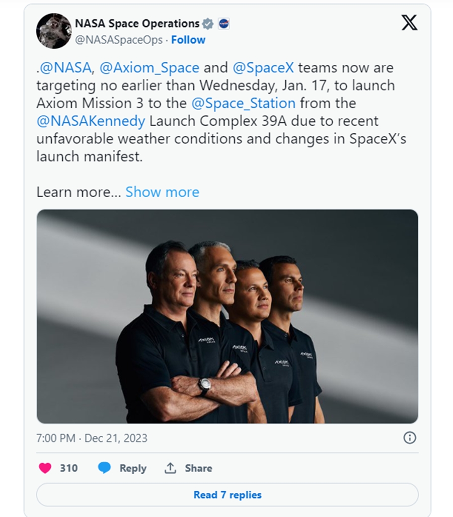 NASA'nın Kennedy Uzay Merkezi'nden yapılan açıklamada, son dönemdeki olumsuz hava koşulları ve SpaceX'in programındaki ayarlamaların, Axiom 3 Misyonu'nun fırlatılmasını 17 Ocak Çarşamba gününden önce mümkün kılmadığını belirtti. Başlangıçta 9 Ocak olarak planlanan fırlatma tarihi, bu gecikme nedeniyle bir haftadan biraz daha uzun bir süre ertelendi.