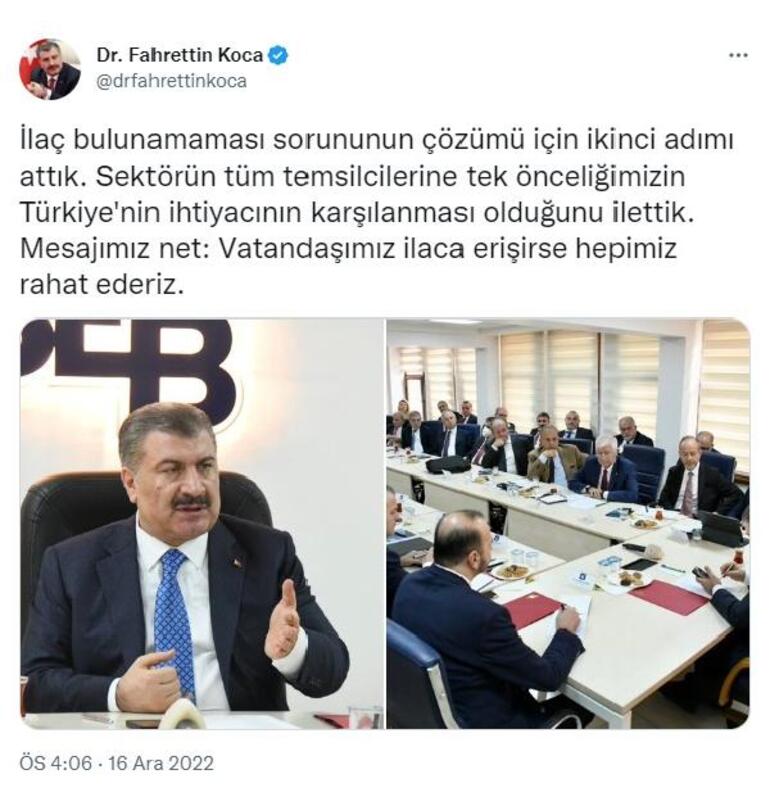 Bakan Koca, Twitter hesabından yaptığı açıklamada, ilaç sektörünün temsilcileri ile bir araya geldiğini belirterek, "İlaç bulunamaması sorununun çözümü için ikinci adımı attık. Sektörün tüm temsilcilerine tek önceliğimizin Türkiye'nin ihtiyacının karşılanması olduğunu ilettik.