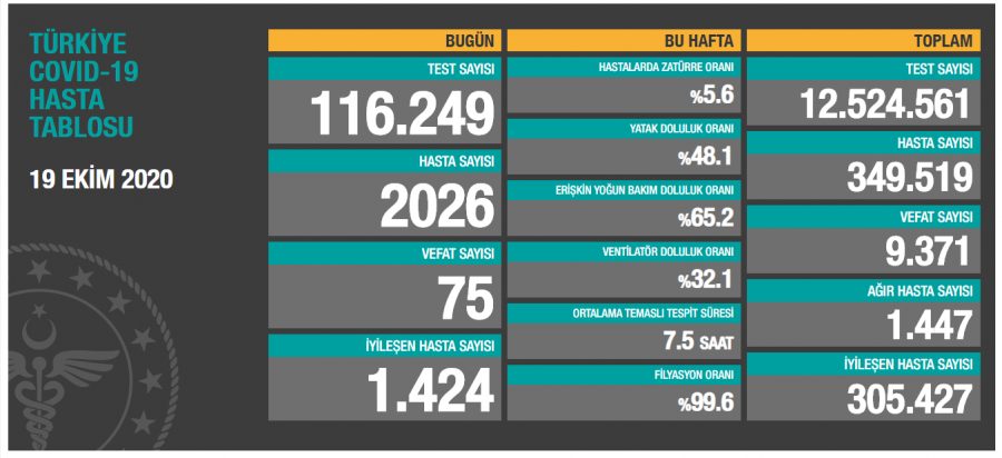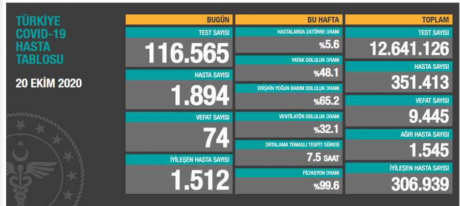 Sağlık Bakanı Fahrettin Koca sosyal medya hesabından yaptığı açıklamada, "Bugün tespit edilen 1.894 yeni hastamız var. Ağır hasta sayımız 1.545'e yükseldi. Sağlık çalışanlarımızın hastaları iyileştirmek için sarf ettiği gayreti biz de tedbirlere uymak için sarf etmeliyiz. Tedbirlere uyarak birlikte mücadeleye destek verin" ifadesini kullandı.