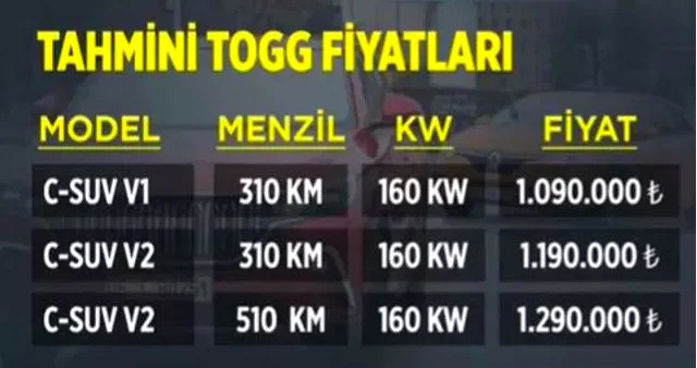 Togg C-SUV segmenti araçların fiyatları için resmi açıklama beklenirken sosyal medyada paylaşılan bir liste kısa sürede elden ele dolaşmaya başladı. Bahsi geçen listede Togg Suv modelinin 310 kilometre benzinli versiyonunun fiyatı 1 milyon 90 bin TL, en uzun menzilli modelinde ise fiyat 1 milyon 290 bin TL olarak gösteriliyor.