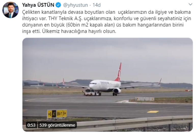"Çelikten kanatlarıyla devasa boyutları olan uçaklarımızın da ilgiye ve bakıma ihtiyacı var. THY Teknik A.Ş. uçaklarımıza, konforlu ve güvenli seyahatiniz için dünyanın en büyük (60bin m2 kapalı alan) üs bakım hangarlarından birini inşa etti. Ülkemiz havacılığına hayırlı olsun."