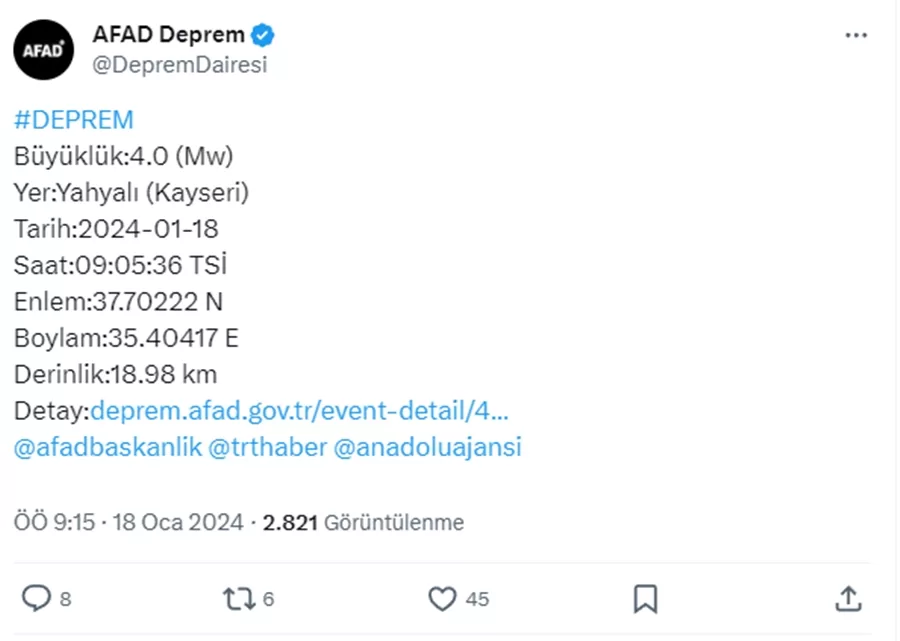 AFAD'ın verilerine göre saat 09.05'te meydana gelen deprem 18,98 kilometre derinlikte gerçekleşti.