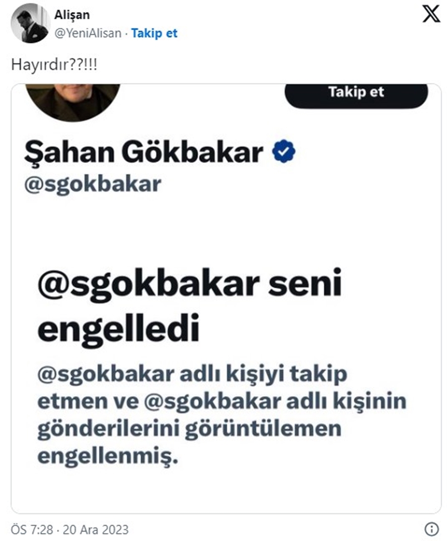 TRT 1 ekranlarında hafta içi her gün izleyiciyle buluşan Alişan, Şahan Gökbakar'ın resmi sosyal medya hesabından kendisini engellediğini fark edince sessiz durmadı.