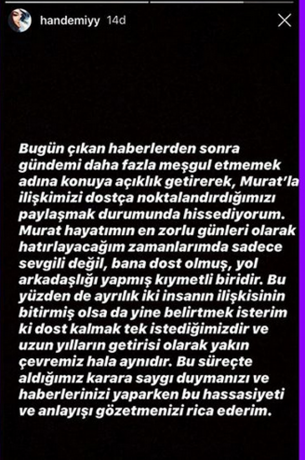 Hande Erçel, sevgilisi Murat Dalkılıç'la ayrılık iddialarını yaptığı açıklamayla doğruladı.