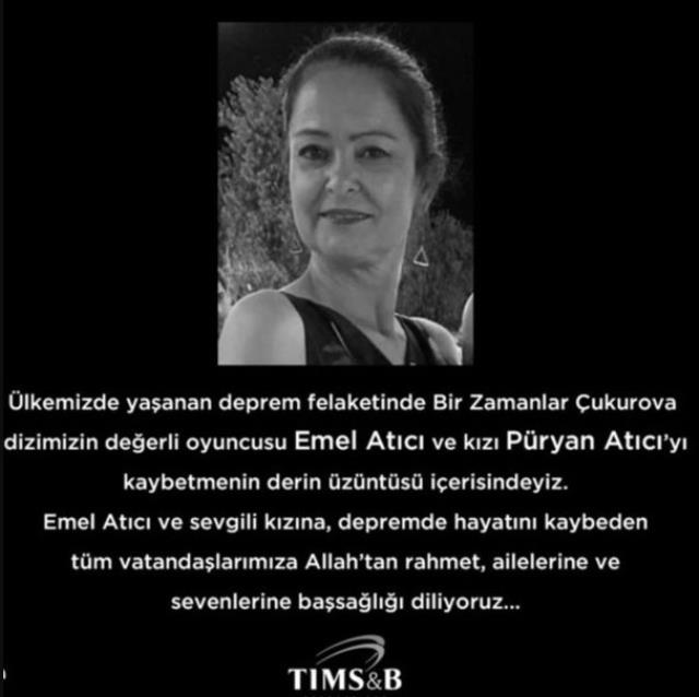 Bir dönem ATV ekranlarında yayınlanan Bir Zamanlar Çukurova dizisinin oyuncularından Emel Atıcı ve kızı depremde hayatını kaybetti. Dizinin yapım şirketi Tims&B, sosyal medya hesabından bir taziye mesajı yayınladı. Paylaşımda "Ülkemizde yaşanan deprem felaketinde Bir Zamanlar Çukurova dizimizin değerli oyuncusu Emel Atıcı ve kızı Püryan Atıcı'yı kaybetmenin derin üzüntüsü içerisindeyim. Emel Atıcı ve sevgili kızına, depremde hayatını kaybeden tüm vatandaşlarımıza Allah'tan rahmet, ailelerine ve sevenlerine başsağlığı diliyoruz" denildi.