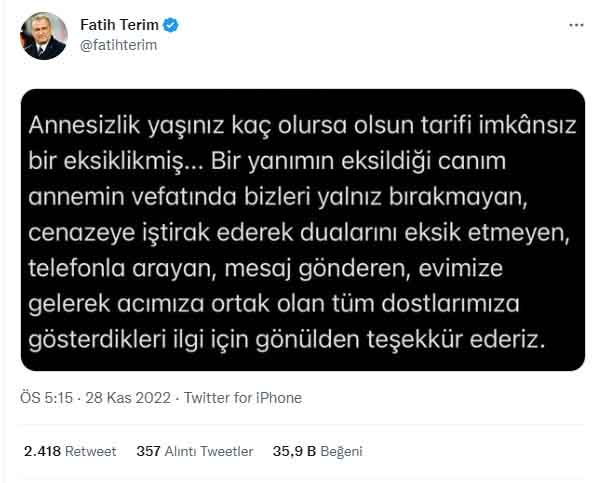 Türk futbolu ve Galatasaray’ın efsane ismi Fatih Terim, geçtiğimiz günlerde kaybettiği annesi Nuriye Terim’i Adana’da toprağa vermişti. Terim, annesini kaybettikten günler sonra sosyal medya hesabından duygusal bir paylaşımda bulundu.