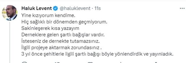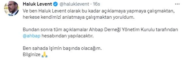 Bu zamana kadar hakkında yapılan yorumlara sık sık cevap veren Haluk Levent, işlerine odaklamadığını belirterek aldığı yeni kararı açıkladı. Twitter hesabından peş peşe paylaşımlar yapan Levent, şu ifadeleri kullandı: "Ve ben Haluk Levent olarak bu kadar açıklama yapmaya çalışmaktan, herkese kendimizi anlatmaya çalışmaktan yoruldum. Bundan sonra tüm açıklamalar Ahbap Derneği Yönetim Kurulu tarafından ahbap hesabından yapılacaktır. Ben sahada işimin başında olacağım. Bilginize..."