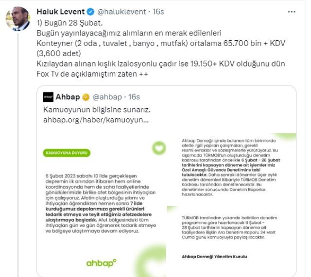 6 Şubat'ta Kahramanmaraş merkezli meydana gelen şiddetli depremler, 11 ilimizde yıkımlara neden oldu. 45 binden fazla vatandaşımızın hayatını kaybettiği deprem felaketinde binlerce bina yerle bir oldu. Kurucusu olduğu Ahbap Derneği ile deprem bölgelerine yardım götüren Haluk Levent ise bu süreçte eleştirilerin hedefi oldu.