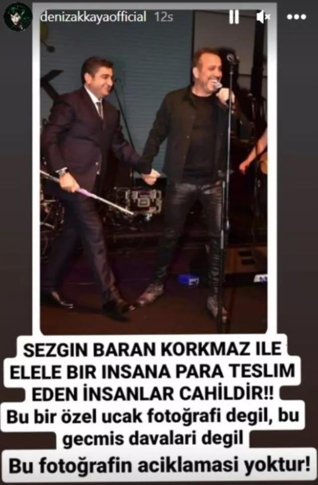 Levent'in Sezgin Baran Korkmaz ile bir fotoğrafını yayınlayan Akkaya, "Sezgin Baran Korkmaz ile el ele bir insana para teslim eden insanlar cahildir! Bu bir özel uçak fotoğrafı değil, bu geçmiş davaları değil. Bu fotoğrafın açıklaması yoktur" ifadelerini kullandı.