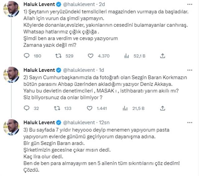 Deniz Akkaya, günlerdir deprem bölgesinde yaptığı yardımlarla gündeme gelen Haluk Levent'i hedef alarak "Duruşsuzluk böyle bir şey. Saklayacak şeyi olmayan adam gibi dik dur. İki ay öncesinde dolandırdığın insanlar yayına çıkmak için bekliyor. Az kaldı hazırlan" dedi.
