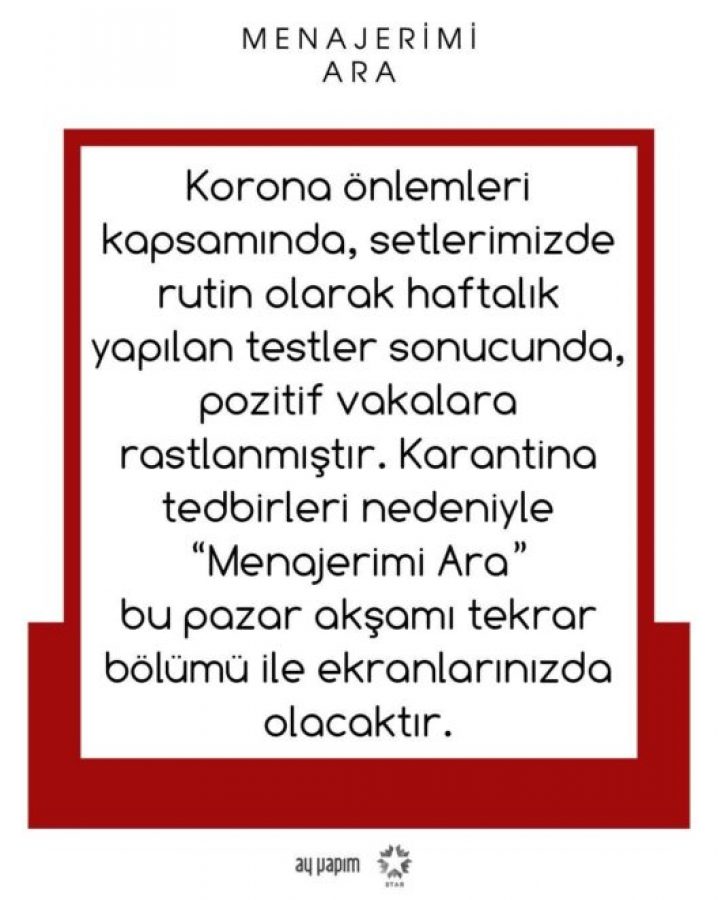 Dizinin setinde yaşanan corona vakaları sonrası Ay Yapım'dan yapılan açıklamada, "Corona önlemleri kapsamında, setlerimizde rutin olarak haftalık yapılan testler sonucunda, pozitif vakalara rastlanmıştır. Karantina tedbirleri nedeniyle 'Menajerimi Ara' bu pazar akşamı tekrar bölümü ile ekranlarınızda olacaktır" denildi.