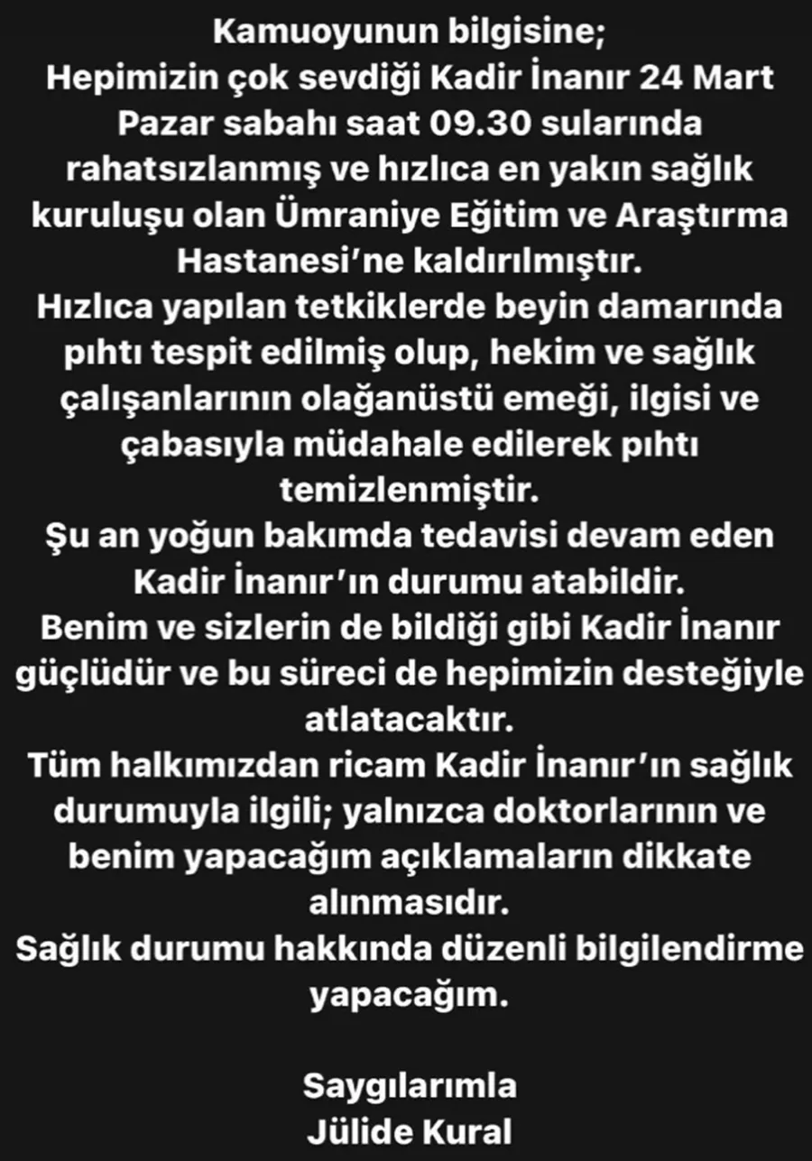 Sanatçının uzun yıllardır birlikte olduğu hayat arkadaşı Jülide Kural, İnanır'ın sağlık durumu hakkında kamuyunu bilgilendirdi. Beyin damarında oluşan pıhtının hızlı müdahale ile temizlendiğini ve İnanır'ın şu anda yoğun bakımda tedavi gördüğünü açıkladı. İşte Kural'ın yaptığı o açıklama: