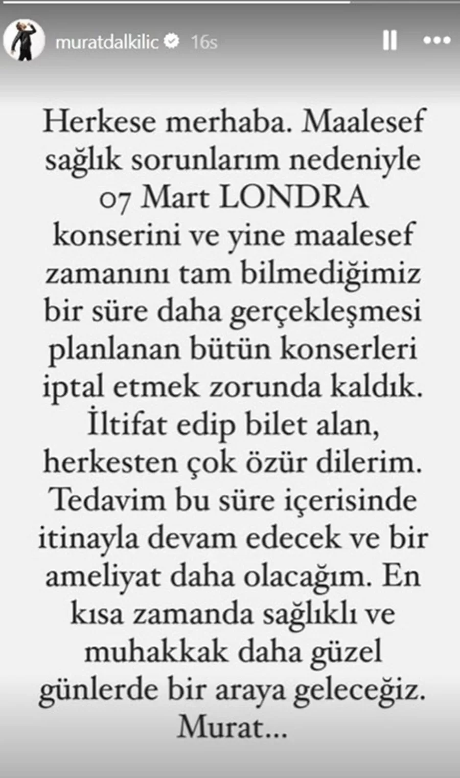 Dalkılıç, sağlık durumuyla ilgili sosyal medya üzerinden açıklama yaparak, hayranlarına gelecekte yeniden buluşacaklarını söyleyerek konser iptali haberlerini duyurdu.