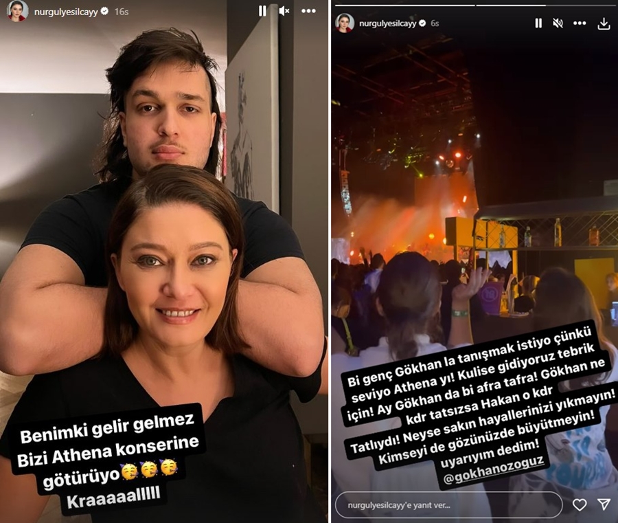 Ünlü oyuncu Nurgül Yeşilçay, dün akşam Londra'dan gelen oğlu Osman Nejat ile birlikte Athena Grubu'nun konserine katıldı. Ancak oğlu Osman Nejat'ın tanışmak istediği Athena Grubu'nun solisti Gökhan Özoğuz'un tavırları, Yeşilçay'ı rahatsız etti.