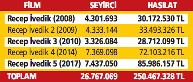 Şahan Gökbakar’ın başrolünde oynadığı ‘Recep İvedik’ serisi, bugüne dek gösterilen 5 filmiyle toplam 26 milyon 767 bin seyirciye ulaştı.