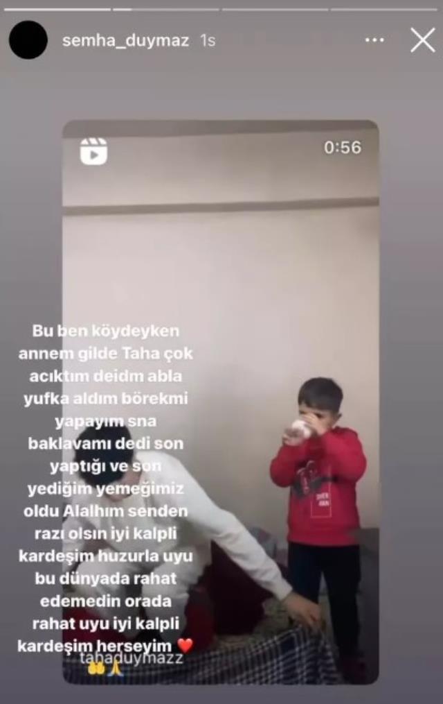 Taha'nın, oğluyla oynadığı bir videoyu paylaşan Semiha Duymaz, "Bu ben köydeyken. Annemgilde. 'Taha çok acıktım' dedim. 'Abla yufka aldım. Börek mi yapayım sana baklava mı?' dedi. Son yaptığı ve son yediğim yemeğimiz oldu. Allah'ım senden razı olsun iyi kalpli kardeşim. Huzurla uyu. Bu dünyada rahat edemedin orada rahat uyu iyi kalpli kardeşim. Her şeyim" dedi.