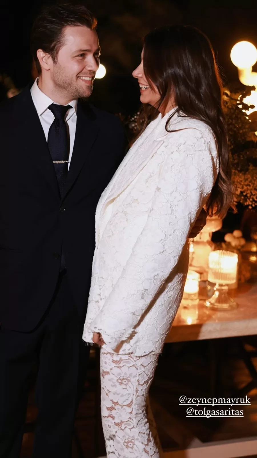 Zeynep Mayruk, nişan töreninde dantelli beyaz bir takım elbise tercih etti.