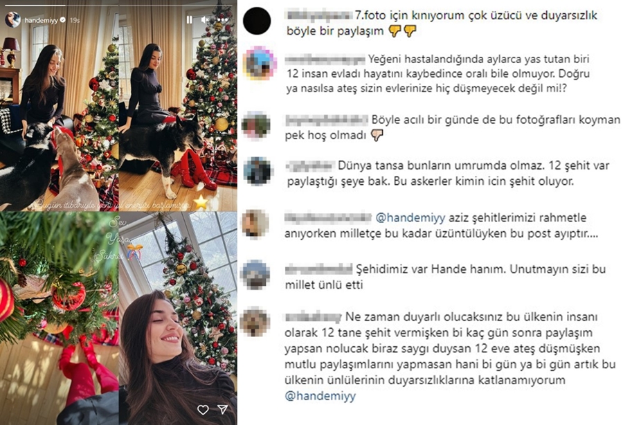 Türkiye Kuzey Irak'ta gerçekleştirdiği Pençe-Kilit Harekatı sırasında 12 askerin şehit düşmesiyle üzüntüye boğulurken, ünlü oyuncu Hande Erçel'in tatil ve yılbaşı paylaşımları sosyal medyada büyük tepki topladı.