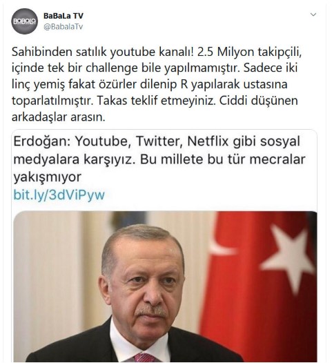 "Sahibinden satılık youtube kanalı! 2.5 Milyon takipçili, içinde tek bir challenge bile yapılmamıştır. Sadece iki linç yemiş fakat özürler dilenip R yapılarak ustasına toparlatılmıştır. Takas teklif etmeyiniz. Ciddi düşünen arkadaşlar arasın."
