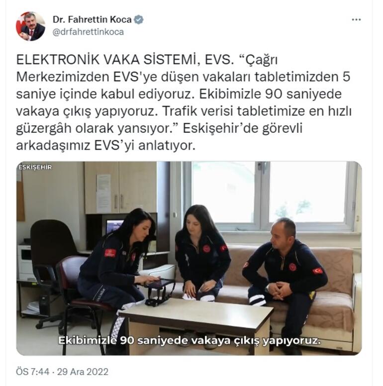 Sağlık Bakanı Koca, Twitter hesabından yaptığı açıklamada, "Çağrı Merkezimizden EVS'ye düşen vakaları tabletimizden 5 saniye içinde kabul ediyoruz. Ekibimizle 90 saniyede vakaya çıkış yapıyoruz. Trafik verisi tabletimize en hızlı güzergah olarak yansıyor.’ Eskişehir’de görevli arkadaşımız EVS’yi anlatıyor" ifadelerini kullandı.
