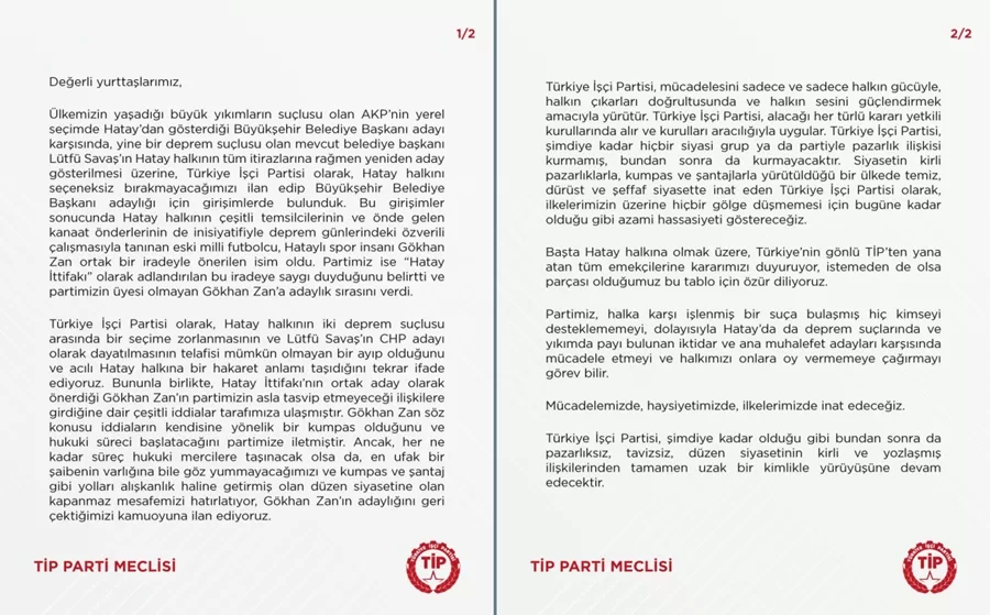 "Ülkemizin yaşadığı büyük yıkımların suçlusu olan AKP'nin yerel seçimde Hatay'dan gösterdiği Büyükşehir Belediye Başkanı adayı karşısında, yine bir deprem suçlusu olan mevcut belediye başkanı Lütfü Savaş'ın Hatay halkının tüm itirazlarına rağmen yeniden aday gösterilmesi üzerine, Türkiye İşçi Partisi olarak, Hatay halkını seçeneksiz bırakmayacağımızı ilan edip Büyükşehir Belediye Başkanı adaylığı için girişimlerde bulunduk. Bu girişimler sonucunda Hatay halkının çeşitli temsilcilerinin ve önde gelen kanaat önderlerinin de inisiyatifiyle deprem günlerindeki özverili çalışmasıyla tanınan eski milli futbolcu, Hataylı spor insanı Gökhan Zan ortak bir iradeyle önerilen isim oldu. Partimiz ise "Hatay İttifakı" olarak adlandırılan bu iradeye saygı duyduğunu belirtti ve partimizin üyesi olmayan Gökhan Zan'a adaylık sırasını verdi.