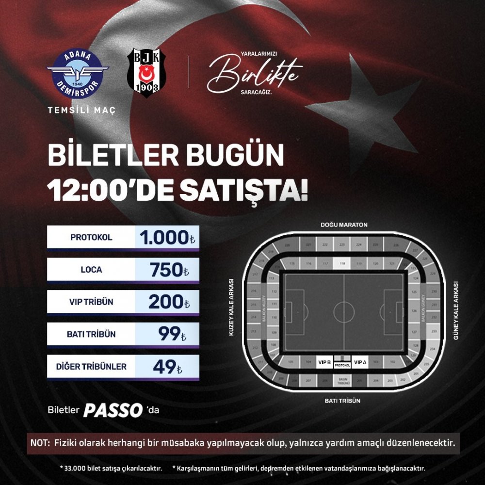 Kahramanmaraş merkezli gerçekleşen ve birçok şehirde yıkıcı hasarlara sebep olan depremlerde zarar görenler için yardım kampanyaları sürüyor. Adana Demirspor da bu kapsamda Beşiktaş ile 19 Şubat Pazar günü saat 20.00'de temsili bir mücadele yapacak. Fiziki bir müsabaka oynanmayacak, sadece yardım amaçlı düzenlenecek bu temsili karşılaşma için 33 bin bilet, bugün 12.00'de satışa sunulacak. Bilet satışından elde edilen gelir depremden etkilenen vatandaşlara bağışlanacak.