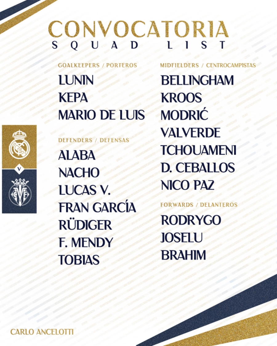 Real Madrid'in Villarreal maçı kadrosunda şu isimler yer alıyor: Lunin, Kepa, Mario de Luis, Alaba, Nacho, Lucas V., Fran Garcia, Rüdiger, Mendy, Tobias, Bellingham, Kroos, Modric, Valverde, Tchouameni, Ceballos, Nico Paz, Rodrygo, Joselu, Brahim.
