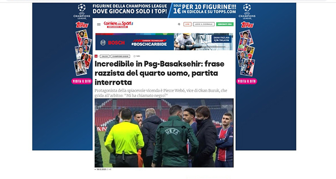 İtalya'nın en önemli spor gazetelerinden Corriere dello Sport, “İnanılmaz Paris Saint Germain-Başakşehir maçı, dördüncü hakemin ırkçı söylemi sonrasında durdu. Başakşehir sahadan çekildi” manşetini atarken, bir başka İtalyan gazetesi Corriere della Sera ise, “4. hakemin ırkçılığı nedeniyle oyun durduruldu. Yardımcı antrenör Webo'ya yapılan söylemin ardından Başakşehir takımı sahadan çekildi ve ardından kulüp, ‘Irkçılığa hayır' twiti attı” ifadelerini kullandı.