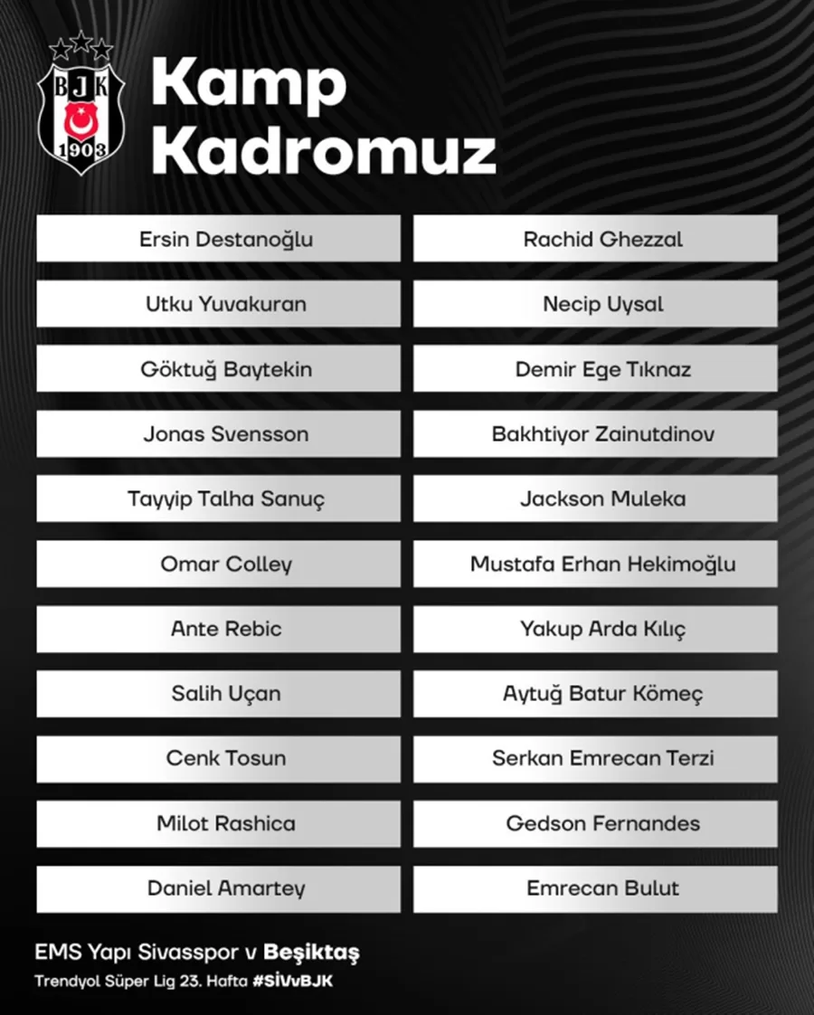 Onur Bulut ise yaşadığı ağrılar sebebiyle Beşiktaş'ın Sivasspor maçı kadrosuna alınmadı. Osteitis pubis şikayeti nedeniyle ağrıları artan Onur Bulut'un iyileşme süreci takip ediliyor. Beşiktaş cephesinden yapılan açıklamada, "Semih Kılıçsoy ve Onur Bulut, EMS Yapı Sivasspor maçı kadrosuna dahil edilmediler." ifadelerine yer verildi. Beşiktaşın Sivassipor kadrosu şöyle: